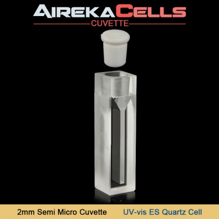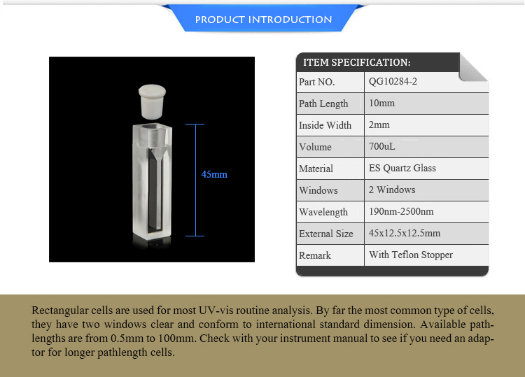 Cuvette, 2 windows, Volume: 700ul, Outer Dim(HxWxD): 45x12.5x4.5mm, Path Length: 10mm, Width: 2mm, with teflon stopper, ES Quartz Glass: 190nm-2500nm