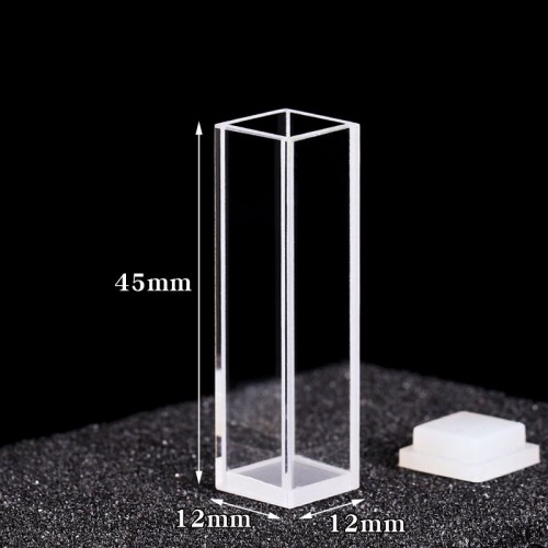 Quartz Particle Analyzer Cuvette, 4 Clear Windows, Volume: 3.5 mL, Outer Dim(HxWxD): 12 x 12 x 45mm, Path Length: 10mm, Inner Width: 10mm, Wavelength: 190 – 2500nm, Fabrication: Glued, PTFE Lid, Packing: 1pc/ea, PN: QG24137-4