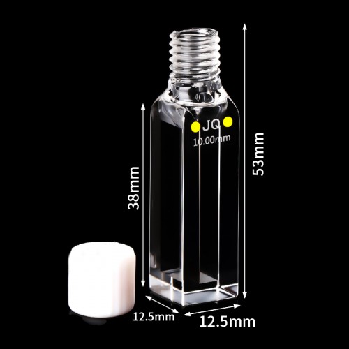 Quartz Semi-Micro Cuvette , 4 Clear Windows, Volume: 1.4 mL, Outer Dim(HxWxD): 12.5 x 12.5 x 53mm, Path Length: 4 / 10mm, Inner Width: 10mm, Wavelength: 190 – 2500nm, Fabrication: Molded, Screw Cap, Packing: 1pc/ea, PN: QG24355-4