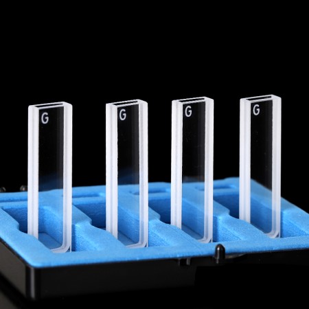 Glass Cuvette, with Lid, 2 Clear Windows, Volume: 0.7 mL, Outer Dim(HxWxD): 12.5 x 4.5 x 45mm, Path Length: 2mm, Inner Width: 10mm, Wavelength: 350– 2500nm, Fabrication: Fused, with Lid, Packing: 4pc/ea, PN: QG24216-2