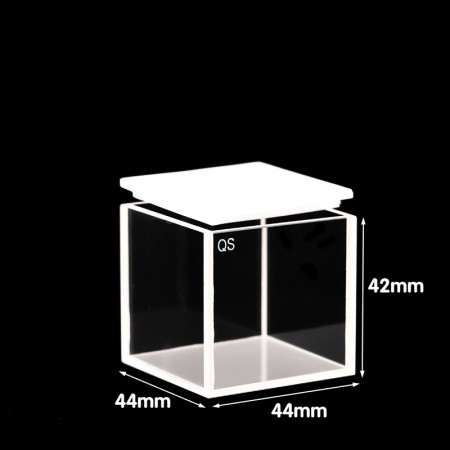 Quartz Cubic Cuvette, 4 Clear Windows, Volume: 64 mL, Outer Dim(HxWxD): 44 x 44 x 42mm, Path Length: 40mm, Inner Width: 40mm, Wavelength: 190 – 2500nm, Fabrication: Fused, PTFE Lid, Packing: 1pc/ea, PN: QG24389-4