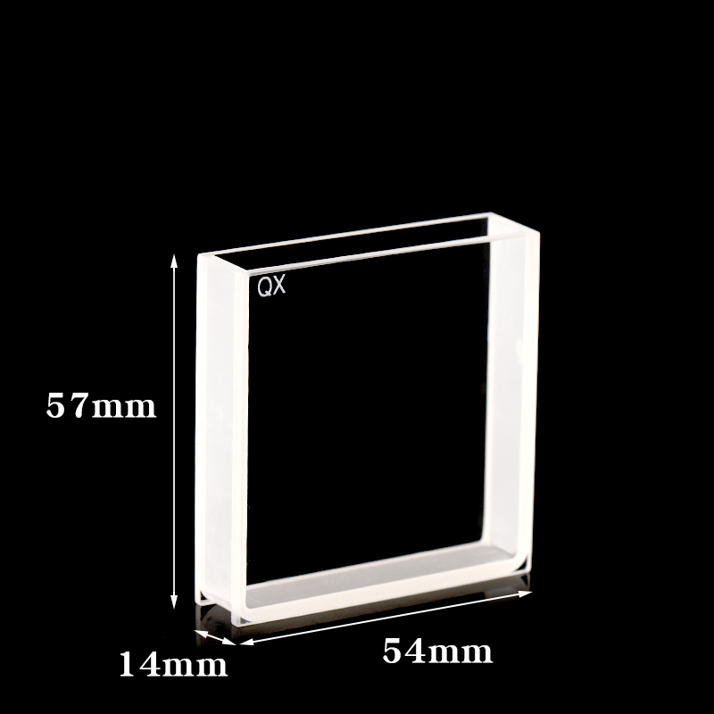 Quartz Customized Cuvette, 2 Clear Windows, Volume: 27 mL, Outer Dim(HxWxD): 54 x 14 x 57mm, Path Length: 10mm, Inner Width: 50mm, Wavelength: 190 – 2500nm, Fabrication: Fused, No Lid, Packing: 1pc/ea, PN: QG24276-2