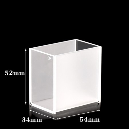 Quartz Customized Cuvette, 2 Clear Windows, Volume: 75 mL, Outer Dim(HxWxD): 34 x 54 x 52mm, Path Length: 50mm, Inner Width: 30mm, Wavelength: 190 – 2500nm, Fabrication: Fused, No Lid, Packing: 1pc/ea, PN: QG24277-2