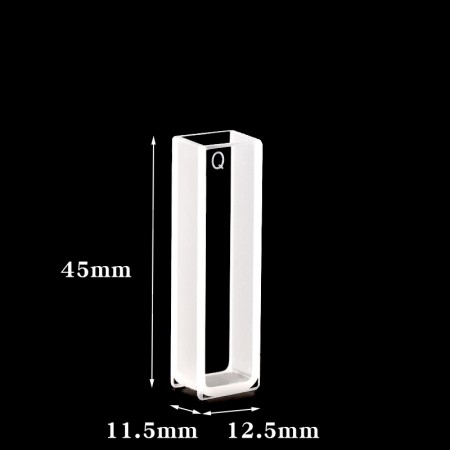 Quartz Customized Cuvette, 2 Clear Windows, Volume: 3 mL, Outer Dim(HxWxD): 12.5 x 11.5 x 45mm, Path Length: 9mm, Inner Width: 10mm, Wavelength: 190 – 2500nm, Fabrication: Fused, No Lid, Packing: 1pc/ea, PN: QG24270-2