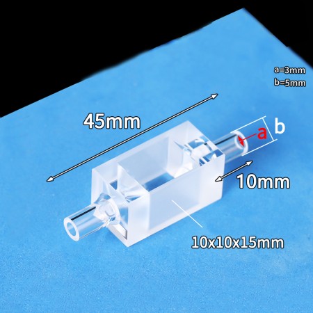Quartz Flow Through Cuvette, 2 Clear Windows, Volume: 1.5 mL, Outer Dim(HxWxD): 12.5 x 12.5 x 25mm, Path Length: 10mm, Inner Width: 10mm, Wavelength: 190 – 2500nm, Fabrication: Molded, Quartz Connector with Funnel Design, OD 5 mm ID 3 mm, Packing: 1pc/ea, PN: QG24739-2