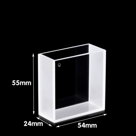Quartz Macro Cuvette, 2 Clear Windows, Volume: 53 mL, Outer Dim(HxWxD): 24 x 54 x 55mm, Path Length: 20mm, Inner Width: 20mm, Wavelength: 190 – 2500nm, Fabrication: Fused, No Lid, Packing: 1pc/ea, PN: QG24369-2