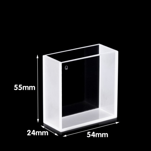 Quartz Macro Special Cuvette, 2 Clear Windows, Volume: 53 mL, Outer Dim(HxWxD): 24 x 54 x 55mm, Path Length: 20mm, Inner Width: 20mm, Wavelength: 190 – 2500nm, Fabrication: Fused, No Lid, Packing: 1pc/ea, PN: QG24507-2