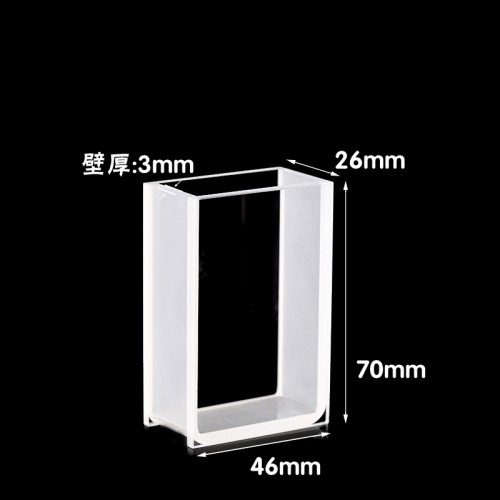 Quartz Macro Special Cuvette, 2 Clear Windows, Volume: 54 mL, Outer Dim(HxWxD): 26 x 46 x 70mm, Path Length: 20mm, Inner Width: 20mm, Wavelength: 190 – 2500nm, Fabrication: Fused, No Lid, Packing: 1pc/ea, PN: QG24508-2