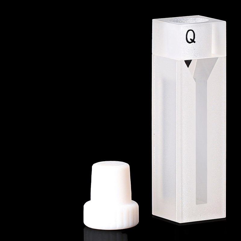 Quartz Semi-Micro Cuvette , 2 Clear Windows, Volume: 1.05 mL, Outer Dim(HxWxD): 12.5 x 12.5 x 45mm, Path Length: 10mm, Inner Width: 3mm, Wavelength: 190 – 2500nm, Fabrication: Fused, PTFE Stopper, Packing: 1pc/ea, PN: QG24328-2