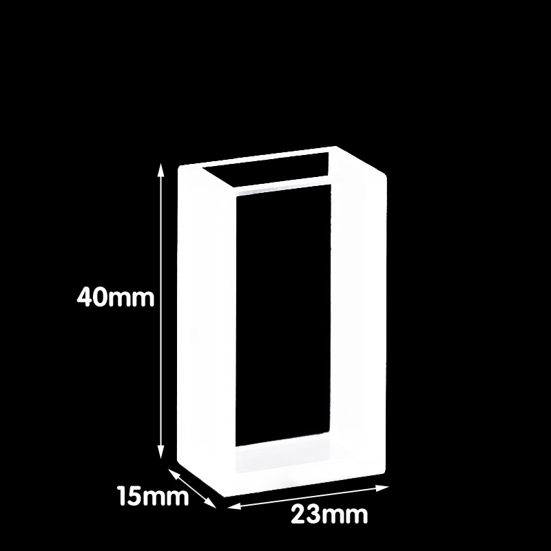 Quartz Special Cuvette, Macro, 2 Clear Windows, Volume: 6 mL, Outer Dim(HxWxD): 15 x 23 x 40mm, Path Length: 10mm, Inner Width: 10mm, Wavelength: 190 – 2500nm, Fabrication: Fused, No Lid, Packing: 1pc/ea, PN: QG24415-2