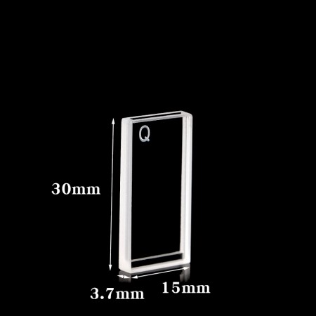 Quartz Special Cuvette, Micro, 2 Clear Windows, Volume: 0.42 mL, Outer Dim(HxWxD): 3.7 x 15 x 30mm, Path Length: 1.2mm, Inner Width: 1.2mm, Wavelength: 190 – 2500nm, Fabrication: Glued, No Lid, Packing: 1pc/ea, PN: QG24408-2
