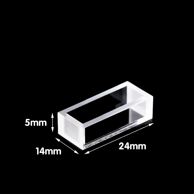 Quartz Special Cuvette, Micro, 3 Clear Windows, Volume: 0.6 mL, Outer Dim(HxWxD): 14 x 24 x 5mm, Path Length: 10mm, Inner Width: 10mm, Wavelength: 190 – 2500nm, Fabrication: Fused, No Lid, Packing: 1pc/ea, PN: QG24410-3