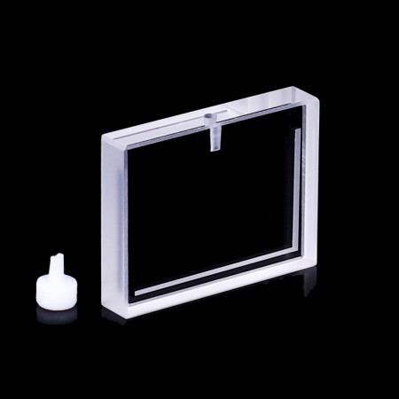 Quartz Special Cuvette with Stopper, 2 Clear Windows, Volume: 350 uL, Outer Dim(HxWxD): 26 x 5 x 20mm, Path Length: 1mm, Inner Width: 22mm, Wavelength: 190 – 2500nm, Fabrication: Fused, Stopper, Packing: 1pc/ea, PN: QG24318-2