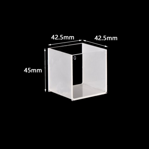 Quartz Tank, Large Cuvette, No Lid, 2 Clear Windows, Volume: 64 mL, Outer Dim(HxWxD): 42.5 x 42.5 x 45mm, Path Length: 40mm, Inner Width: 40mm, Wavelength: 190 – 2500nm, Fabrication: Fused, No Lid, Packing: 1pc/ea, PN: QG24124-2
