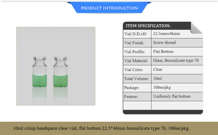 10ml crimp headspace clear vial, flat bottom 22.5*46mm borosilicate type 70, 100ea/pkg ..